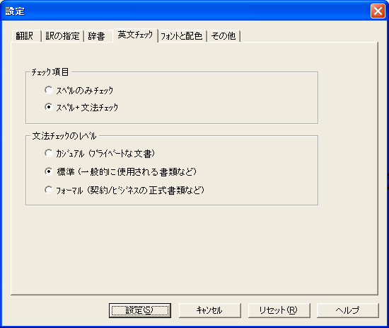 ここでは、「スペル+文法チェック」を選び、文法チェックのレベルを「標準」にしました。