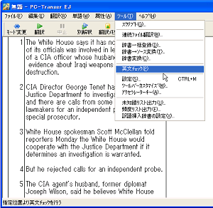 | 試しにVoice OF AmericaのWEBサイトから英語ニュースを読み込んでチェックしてみます。 「ツール」→「英文チェック」をクリックしましょう(図2)。