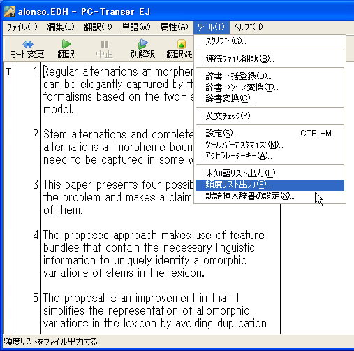 頻度リストを出力するには、先ず原文を読み込んでから、「ツール」メニュー→「頻度リスト出力」をクリックします(図1)。
