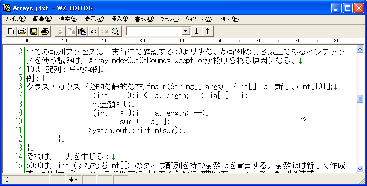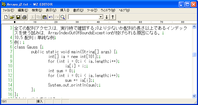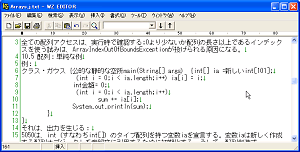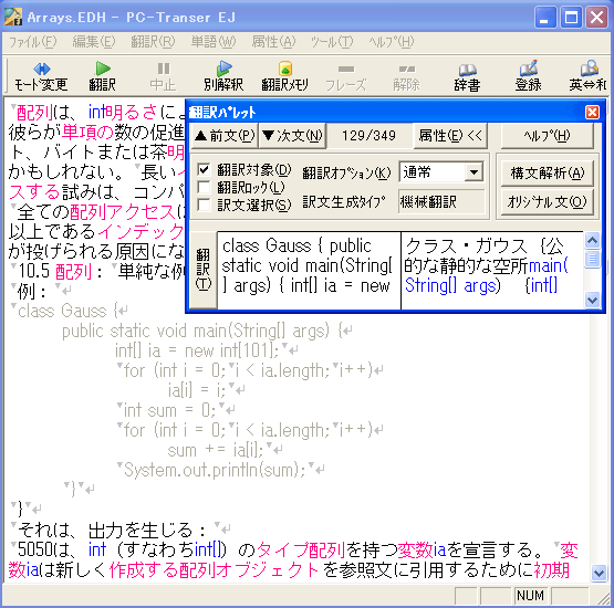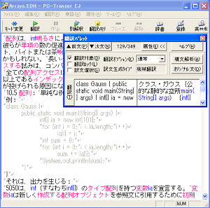 (図8)ではJAVAの説明文の途中にあるコードが「class Gauss〜」→「クラス・ガウス〜」のように翻訳されているのを、その部分だけ翻訳パレットで原文に戻したところです。